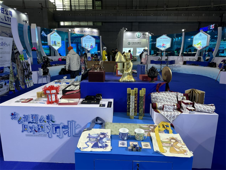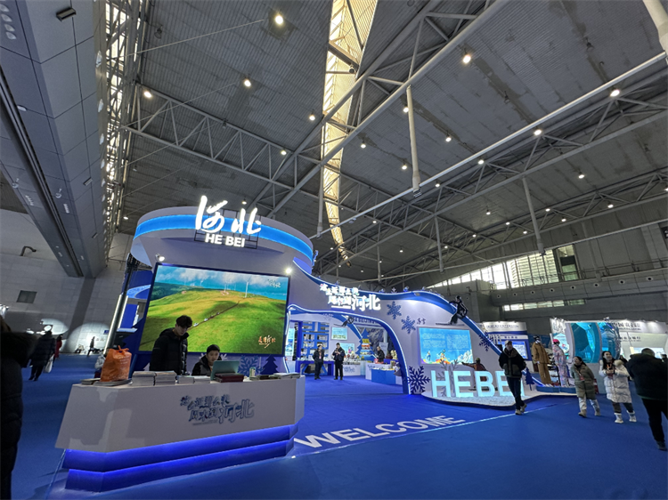 此次参展,河北展区以“这么近,那么美,周末到河北”为主题,展区整体以冰之蓝、雪之白为基础色调,寓意纯洁冰雪、未来与梦想,展区外形设计借鉴了北京2022年冬奥会跳台滑雪项目运动场馆——雪如意的外形,彰显河北作为冬奥会举办地的独特地位。雪花、雪人等冰雪元素点缀其间,展现了河北冰雪旅游魅力,展示河北深厚的冰雪文化底蕴。展区设有杂技演出、精品线路、文创产品、冰雪装备及互动体验、对接洽谈等板块,采用艺术展墙、电子屏、互动体验设备以及文创、冰雪装备实物展陈等多种方式,展示10条河北冰雪旅游精品线路、2个冬季旅游资源重点县(张家口市崇礼区、承德市隆化县)、3家滑雪场、4家冰雪装备企业、7家文创和旅游商品企业,以及冰壶、模拟滑雪等多个互动体验项目、300多种精品文创和旅游商品,并组织了顶坛、吊剑、空竹、高车踢碗的杂技节目演出,集精品文化旅游资源推介、文旅企业形象展示、文创和旅游商品展售、冰雪互动项目体验及商务对接洽谈等功能于一体。