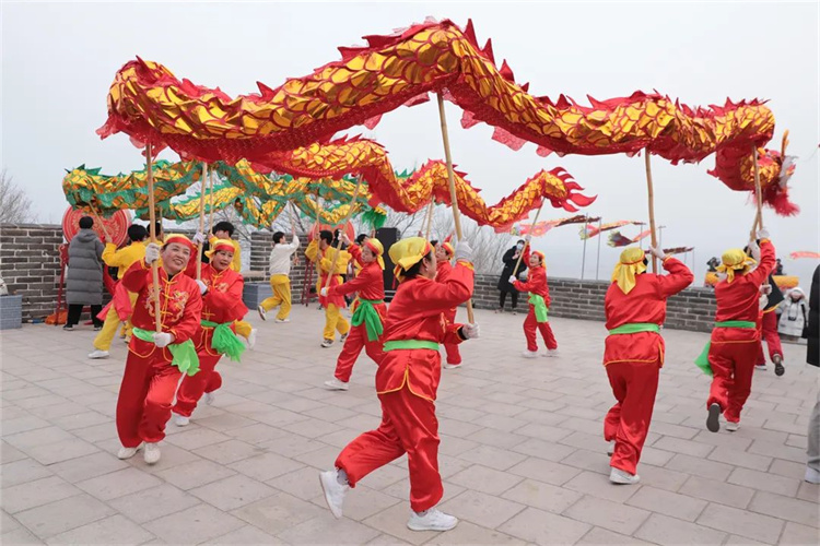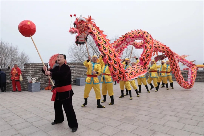 龙年舞瑞龙,龙鼓颂祝福。上午10时,秦皇岛山海关老龙头景区澄海楼前,十几面威武的靠旗迎风飘扬,在非遗传承人挥舞鼓槌击鼓的锣鼓声中,舞龙及非遗集中展演活动让老龙头正式击鼓起舞。