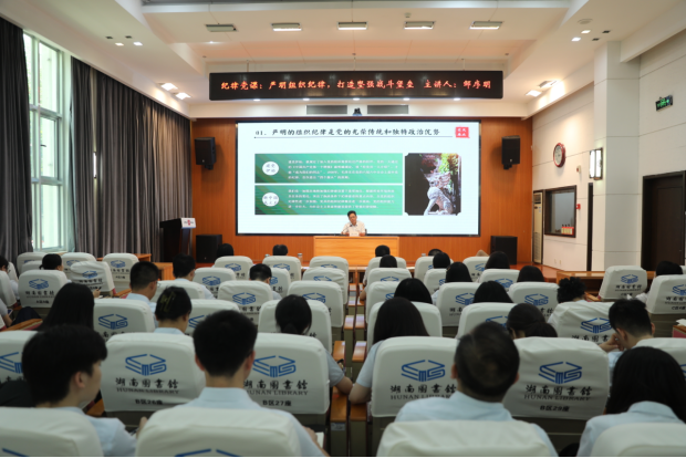 7月8日,湖南图书馆党委副书记、副馆长邹序明以“严明组织纪律,打造坚强战斗堡垒——学习贯彻《中国共产党纪律处分条例》组织纪律篇”为题,为全馆党员讲授党纪学习教育专题党课。