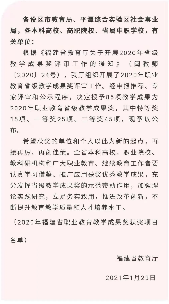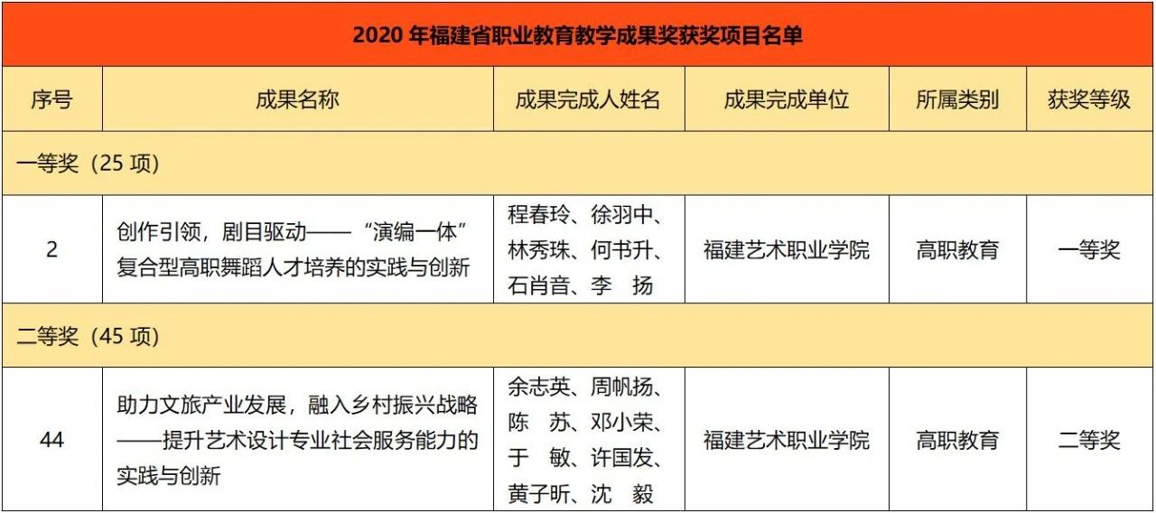 近日,福建省教育厅公布2020年福建省职业教育省级教学成果奖获奖名单,我校申报推荐的2个项目获奖:《创作引领,剧目驱动——“演编一体”复合型高职舞蹈人才培养的实践与创新》荣获一等奖,《助力文旅产业发展,融入乡村振兴战略——提升艺术设计专业社会服务能力的实践与创新》荣获二等奖。